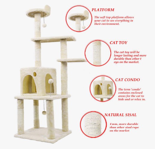| Smuk og behagelig | Den naturlige struktur og farve på miljøvenlig træ tilsætter en varm og naturlig atmosfære til træstårnet Condo Cat Tree -klatringramme, der giver et varmt og behageligt hvilemiljø for katte |
