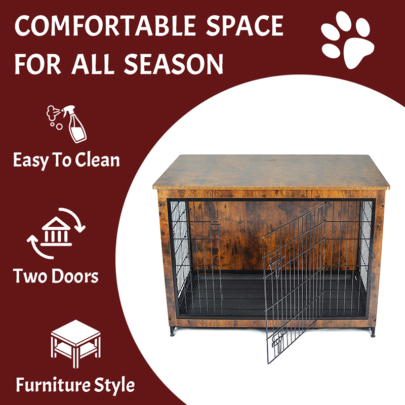 1. Sikkert og sundt materiale: Møblerstil Hundbur Valgt fast træramme med lavt kulstofståltråd, afrundede hjørner Anti-scratch-design, ABS-kompositplastikbakke, alt for bevogende kæledyrsikkerhed.